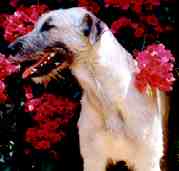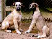 | PUPPIES grow, like acorns, into mighty hounds of "great size and commanding appearance". This 1995 14-week old pair have been entered into our breeding program for the 1997 winter season. Ce-Ce (left), Sunstag Celebration, is actively being shown and coursed. Dezi (right), Fenrier's B-Sunstag By Design, was imported from Germany to add more vitality to an already strong line. He is currently being campaigned in conformation and is a lure coursing champion. |