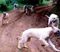 | PUPPIES at play! They, too, enjoy the wide open spaces of our adjacent hills and mountains. It is good exercise, builds confidence and helps develop the muscling so important in a coursing hound. |